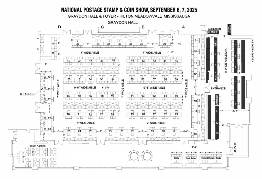 The bourse (laid out in the final floor plan below) is located in the brightly lit 9000-square-foot Graydon Ballroom at the popular four-star Hilton Mississauga on 6750 Mississauga Rd. in Mississauga, Ont. In addition to offering a smorgasbord of material on the bourse, our dealers always offer appraisals of show-goers’ material. Be sure to take advantage of this great opportunity at this April’s show!